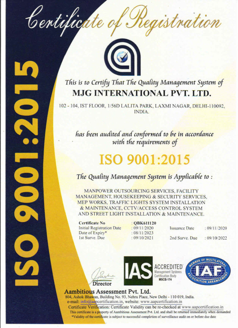 MJG International Private Limited (MJGI), incorporated in 2017, is an ISO-Certified Company that offers a whole range of Soft services viz. Manpower Outsourcing, Housekeeping, Security Services as well as Hard services viz. HVAC maintenance, DG operation and maintenance, fire safety systems, CCTV/Access control systems, Intelligent Transportation Systems (ITS).